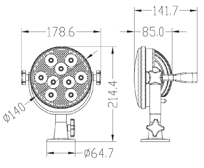 Αδιάβροχος. Από κράμα αλουμινίου με βάση από κράμα ψευδαργύρου. Διαθέτει μοχλούς για ρύθμιση της γωνίας-θέσης του προβολέα και αντάπτορα για σύνδεση στον αναπτήρα.